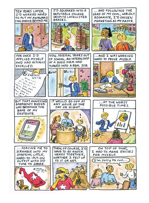 Part of it was in keeping with my intention to make this a humorous take on what being a superhero would really be like, in contrast to the glamorous portrayals typically seen. (After all, considering that they lead secret double lives, I figure superheroes must be more --- not less --- harried and frazzled than the rest of us). It was also meant to reflect a bit on Amy's personality, as a no-nonsense person, very focused on her work, and on the fact that having been raised by neglectful cat-hoarders and treated like an outcast during her early schooling, her self-esteem is a bit shaky, and she's sort of at a loss for how to make herself look fancy or project pulled-together confidence.