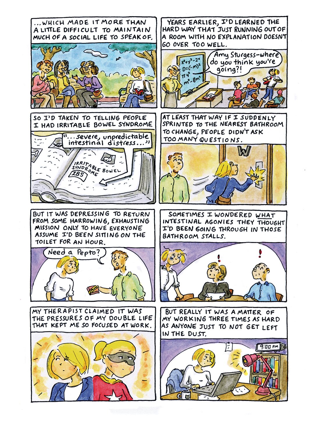 It was from there that I started thinking through the logistics of what it would take to juggle regular life with the demands of being a masked vigilante. (It was also at that point that it occurred to me that claiming to have Irritable Bowel Syndrome, as Amy does, could be very handy cover for perpetually having to drop everything and run off to the nearest bathroom to change.)